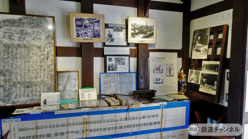 興味深い写真やパネルがたくさん並んでいます。古い土蔵の内部らしい佇まいも魅力があります。