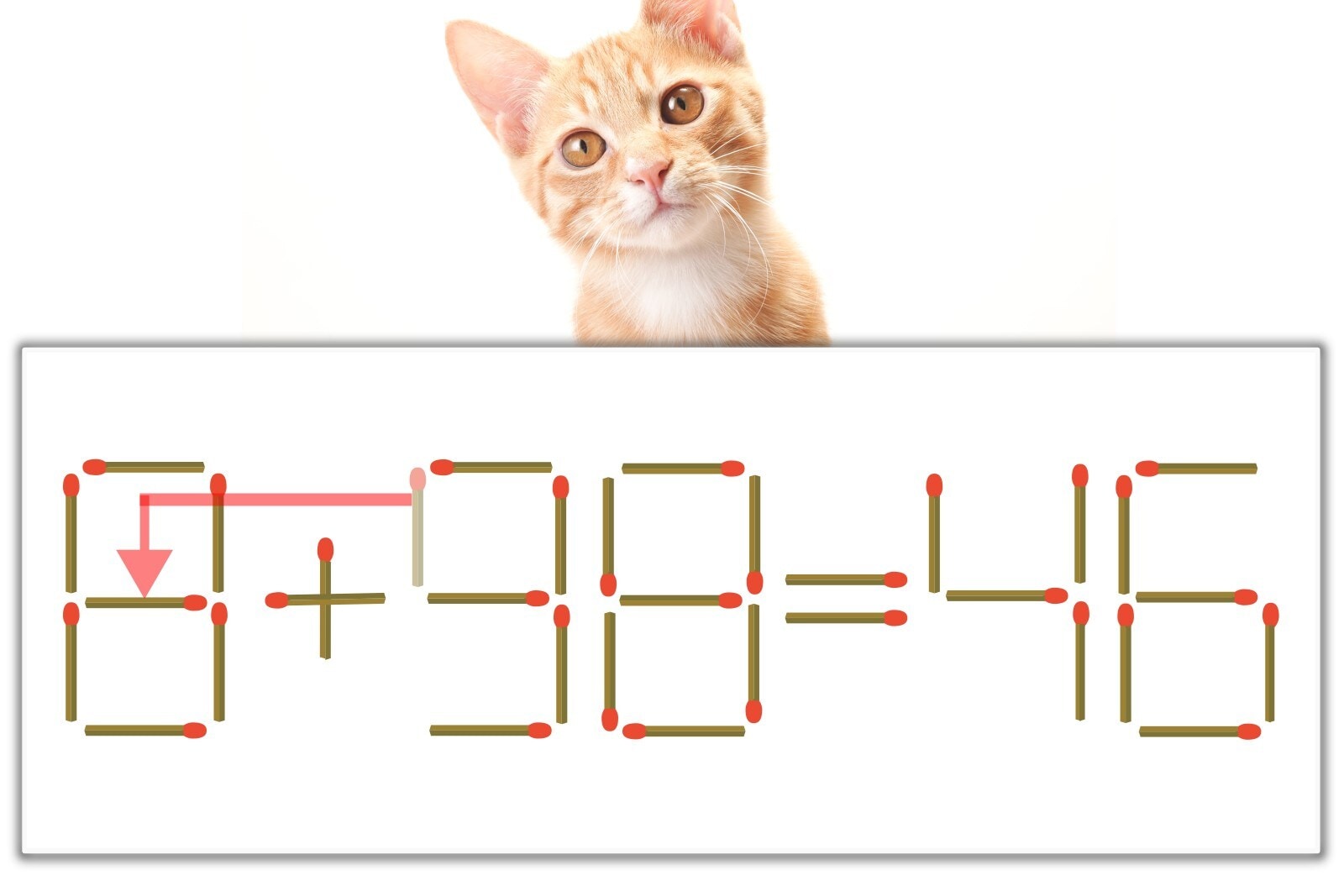 「9」を別の数字に変化させると答えが導き出せます。「9」のマッチ棒を1本移動して、「0」を「8」にしてみましょう。すると、「8+38=46」が成立します。