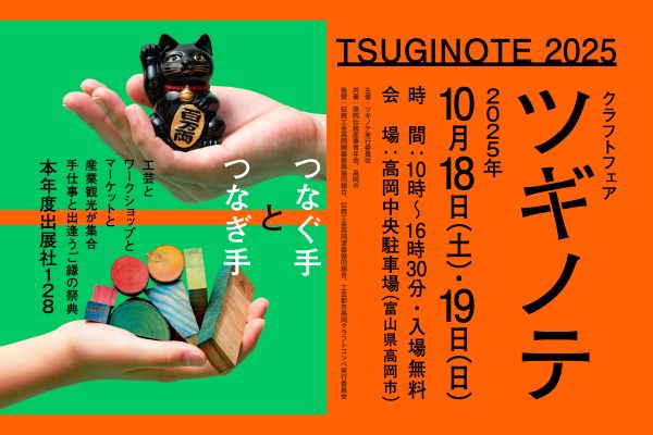 大量生産、消費の時代を通り過ぎ、伝統的な手法や個性的なアイテムを生む「ものづくり」に回帰し始めた昨今。「ものづくりを未来へつなぐ」をテーマにした「クラフトフェア ツギノテ」(ツギノテ実行委員会・富山県高岡市)が10月18日(土)・19日(日)の2日間、富山県高岡市で開催される。開催時間は10時~16時30分。全国から128社のクラフト作家、クリエーター、製造メーカーが一堂に会するフェアで、見る・買う・食べる・体験するを一気に楽しめる。