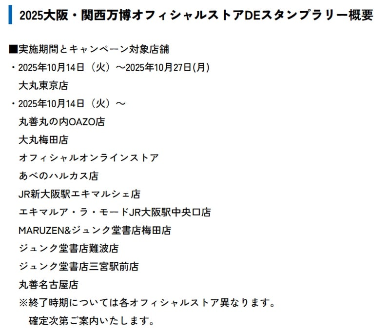 大阪・関西万博オフィシャルストアの一部店舗は、万博が閉幕する10月13日の翌日以降も営業を継続。閉幕後の2025年10月14日(火)~2026年1月31日(土)の期間でスタンプラリーを実施します。店舗ごとの詳しい営業期間や営業時間、キャンペーンの詳細や最新情報につきましては、公式サイトでご確認ください。