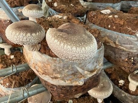 国内の食用きのこ生産量は2011年を境に減少傾向で、2023年は前年⽐5.1%減の約43.6万トン。生しいたけも同6.5%減の約6万3千トンにとどまった。生産者数も2000年の8.6万戸から2022年には2.3万戸まで減少し、そのうち原木しいたけ農家は1.2万戸にまで縮小している。