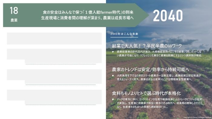 電通マクロミルインサイト(東京都中央区)と国内の電通グループ6社の横断組織「未来事業創研」は、2040年の社会実態を予測し、中長期的な未来から逆算して企業の持続可能な事業創造を支援するツール「電通 未来ファインダー100」を25年版にアップデートした。