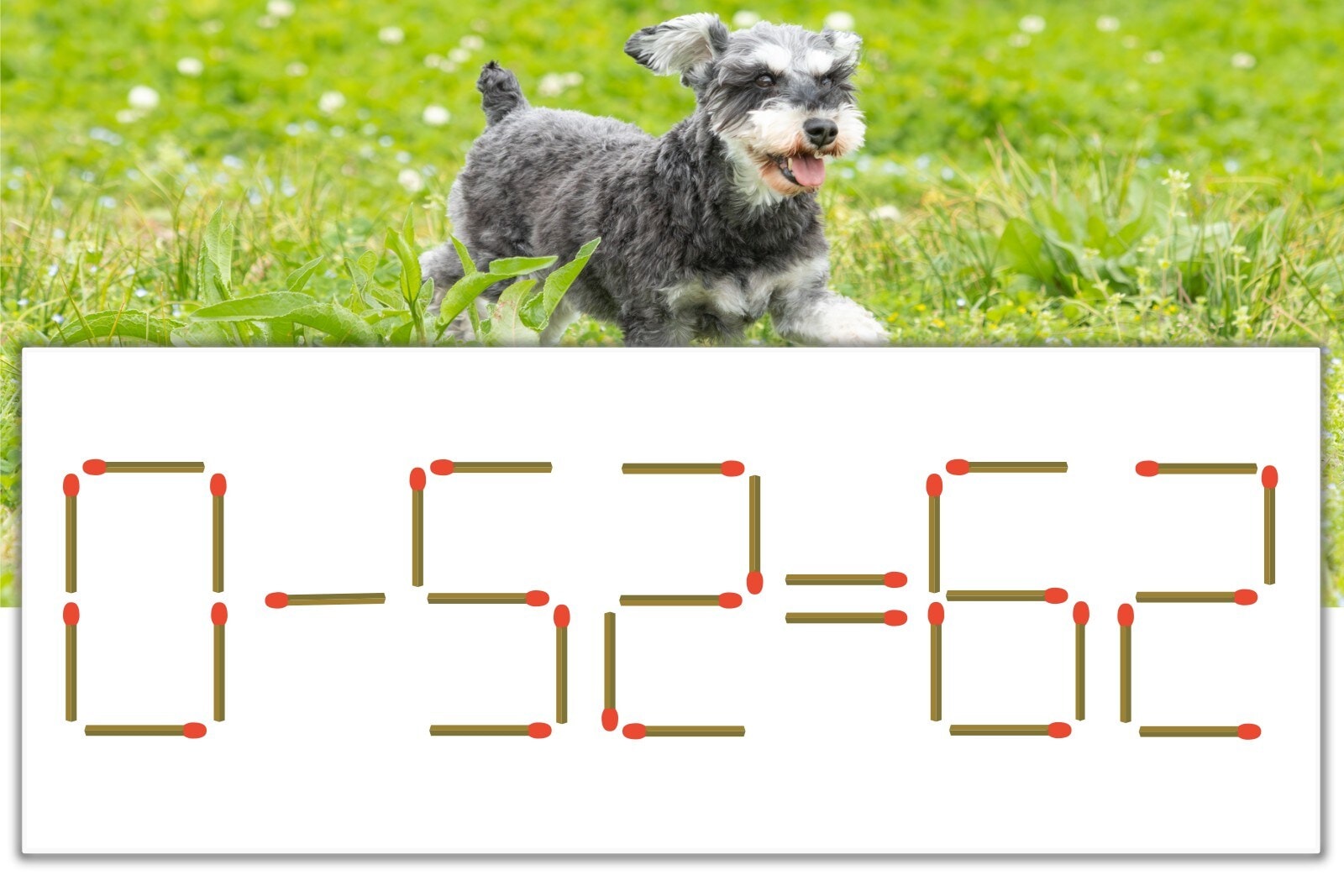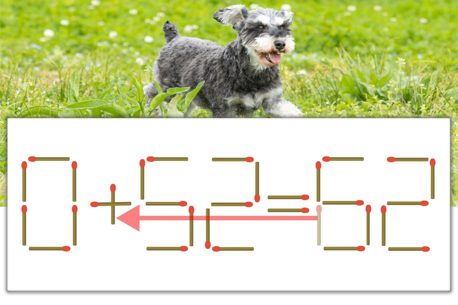 「6」を別の数字に変化させると答えが導き出せます。「6」のマッチ棒を1本移動して、「-」を「+」にしてみましょう。すると、「0+52=52」が成立します。
