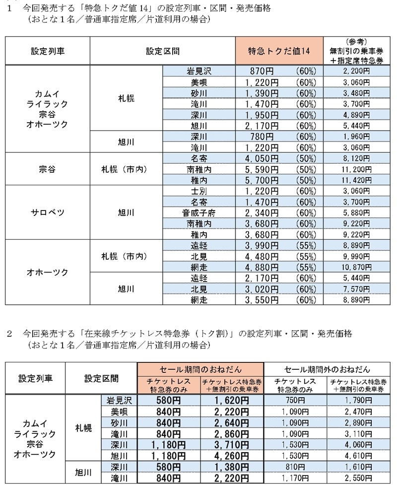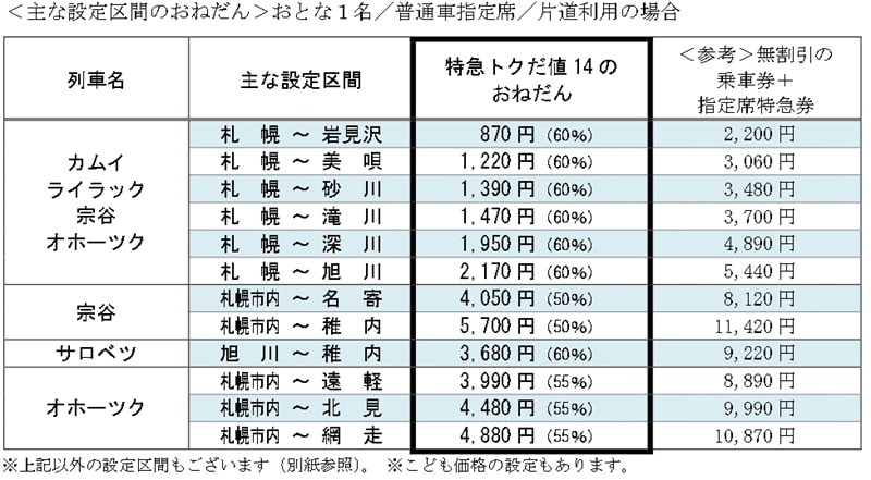 ①特急トクだ値14は道北の設定区間が50~60%OFFに
