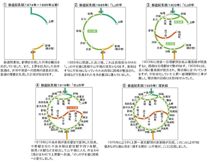 山手線の原型は、1885年に開通した品川~赤羽間を結ぶ品川線で、西側部分だけで「し」の字を描く形でした 上記②。