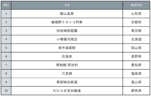 そのほかTOP10には、駅舎や温泉街など懐かしさを感じるレトロスポットに紅葉が彩りを添え、ロマンティックな景色が楽しめる場所が多数ランクイン。4位となった北海道の「小樽運河周辺」、5位の岡山県の美作滝尾駅など、歴史的な建造物に紅葉がマッチする光景が人気だった。