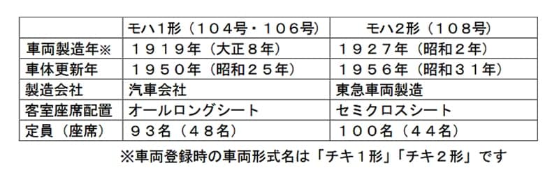 スペックは別表の通りで、いずれも戦前生まれ。3両とも戦後に車体を新調したが、更新から数えても70年前後を経過する。