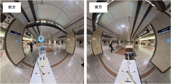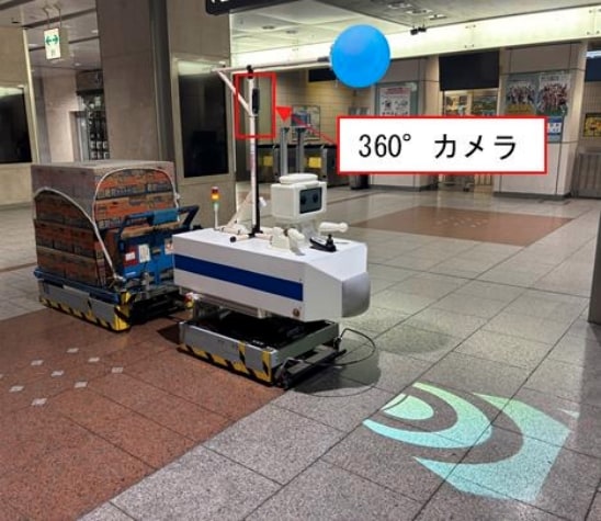 試験では、係員付き添いのもと、自動搬送ロボットが荷物台車を牽引して所定のルートを走行します。ロボットには360度カメラが搭載されており、周囲の状況を撮影。さらに、天井に設置されたセンサーで点群データを取得し、ロボット走行時の人の流れを分析します。