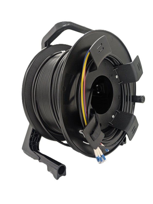 この光ケーブルは、ステンレスモノコイルを内蔵し、自動車や小動物による物理的損傷から光ファイバを守る設計が特徴です。防水機能も備えており、急な悪天候でも光ファイバの損傷を防ぎます。リールは樹脂製で軽量化されており、どこでも簡単に取り扱い、展開が可能です。