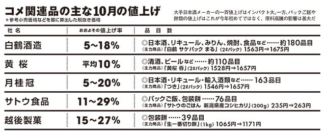 酒造大手は、10月1日出荷分から値上げに踏み切った。店頭価格の上げ幅は、白鶴酒造(兵庫県神戸市)が5~18%、月桂冠(京都市)が5~20%、黄桜(同)が平均10%となっている。いずれもその理由の筆頭に、原料米価格の高騰を挙げた。
