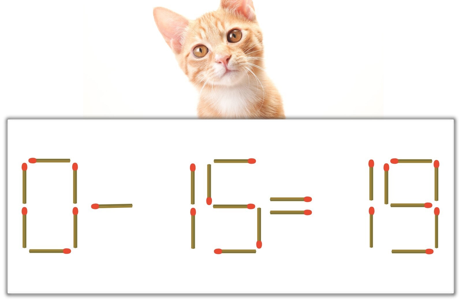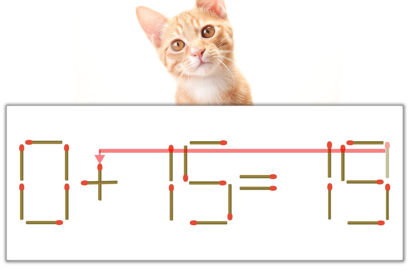 「9」を別の数字に変化させると答えが導き出せます。「9」のマッチ棒を1本移動して、「-」を「+」にしてみましょう。すると、「0+15=15」が成立します。
