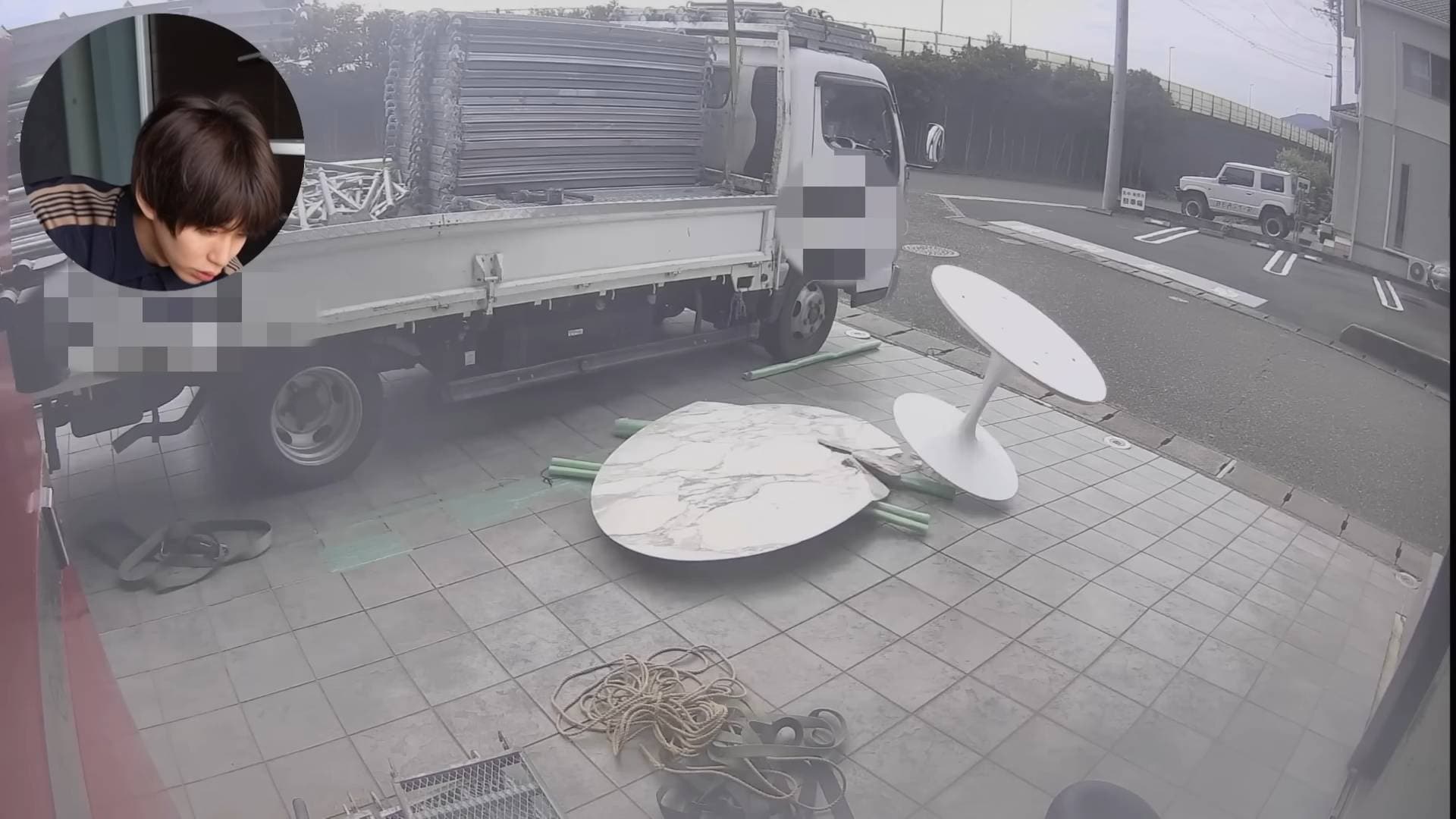 当時の防犯カメラの映像をチェックすると、最初のほうでは無事に降ろされた天板部分が映っていました。しかし次の瞬間、画面上部からテーブルの脚部分が降ってきて大理石の天板の上に落下。天板は割れてしまいました。