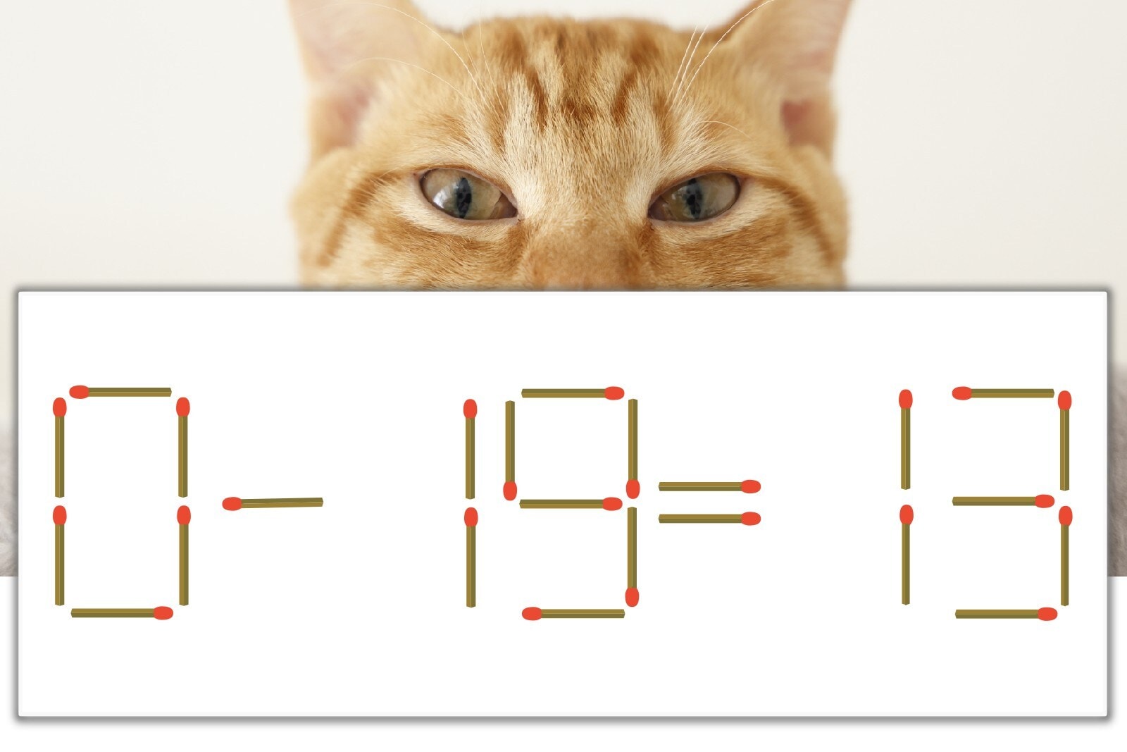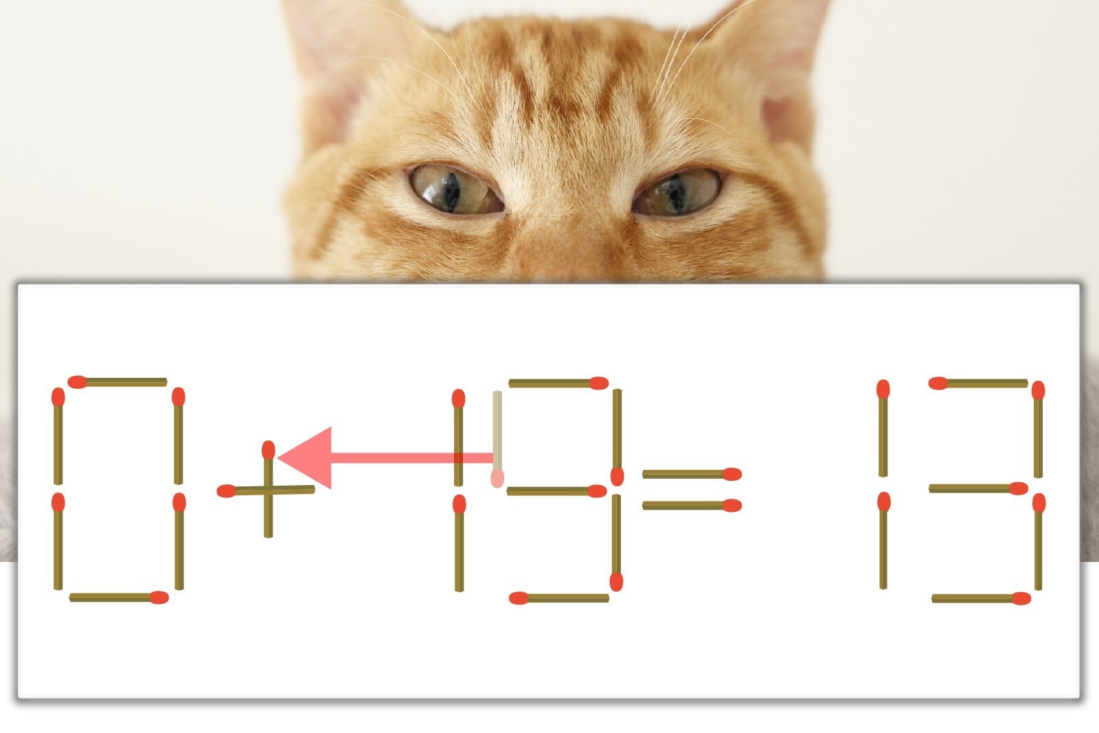 「9」を別の数字に変化させると答えが導き出せます。「9」のマッチ棒を1本移動して、「-」を「+」にしてみましょう。すると、「0+13=13」が成立します。