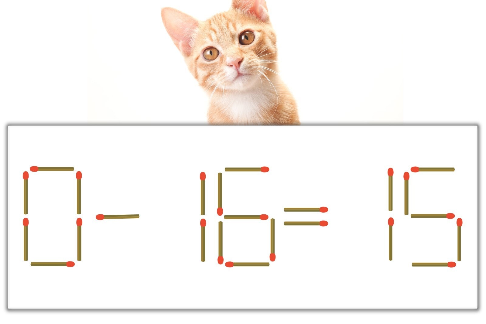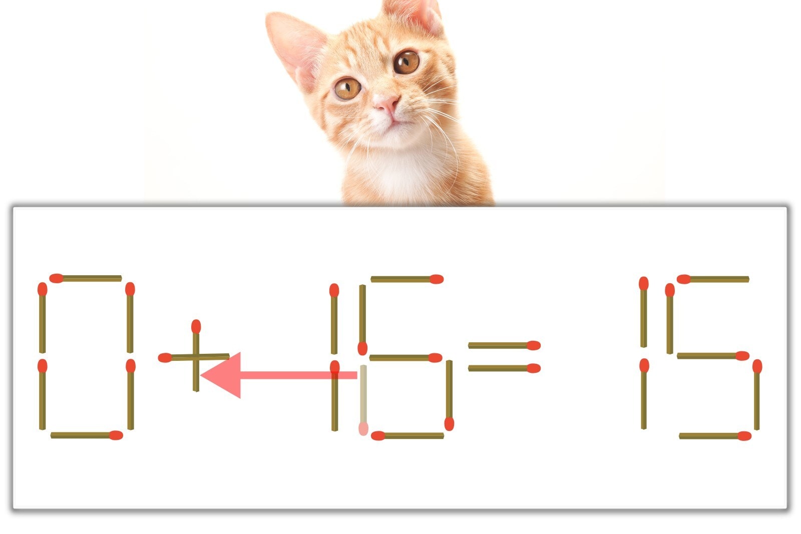 「6」を別の数字に変化させると答えが導き出せます。「6」のマッチ棒を1本移動して、「-」を「+」にしてみましょう。すると、「0+15=15」が成立します。