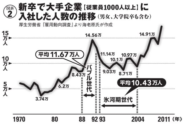 しかし、平均すれば、バブル期(年平均11.7万人)と氷河期(同10.4万人)の差は1割程度に過ぎません。『氷河期の就職先は中小零細ばかり』という見方も実態とは違います」