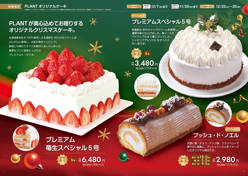 パンフレット掲載商品をご予約のお客様には、商品の本体価格の5%分のPLANT Pay限定ボーナスを還元し、クリスマスケーキ・アイスをご予約いただいたお客様にはソフトドリンク1本を進呈いたします。早速のご予約を