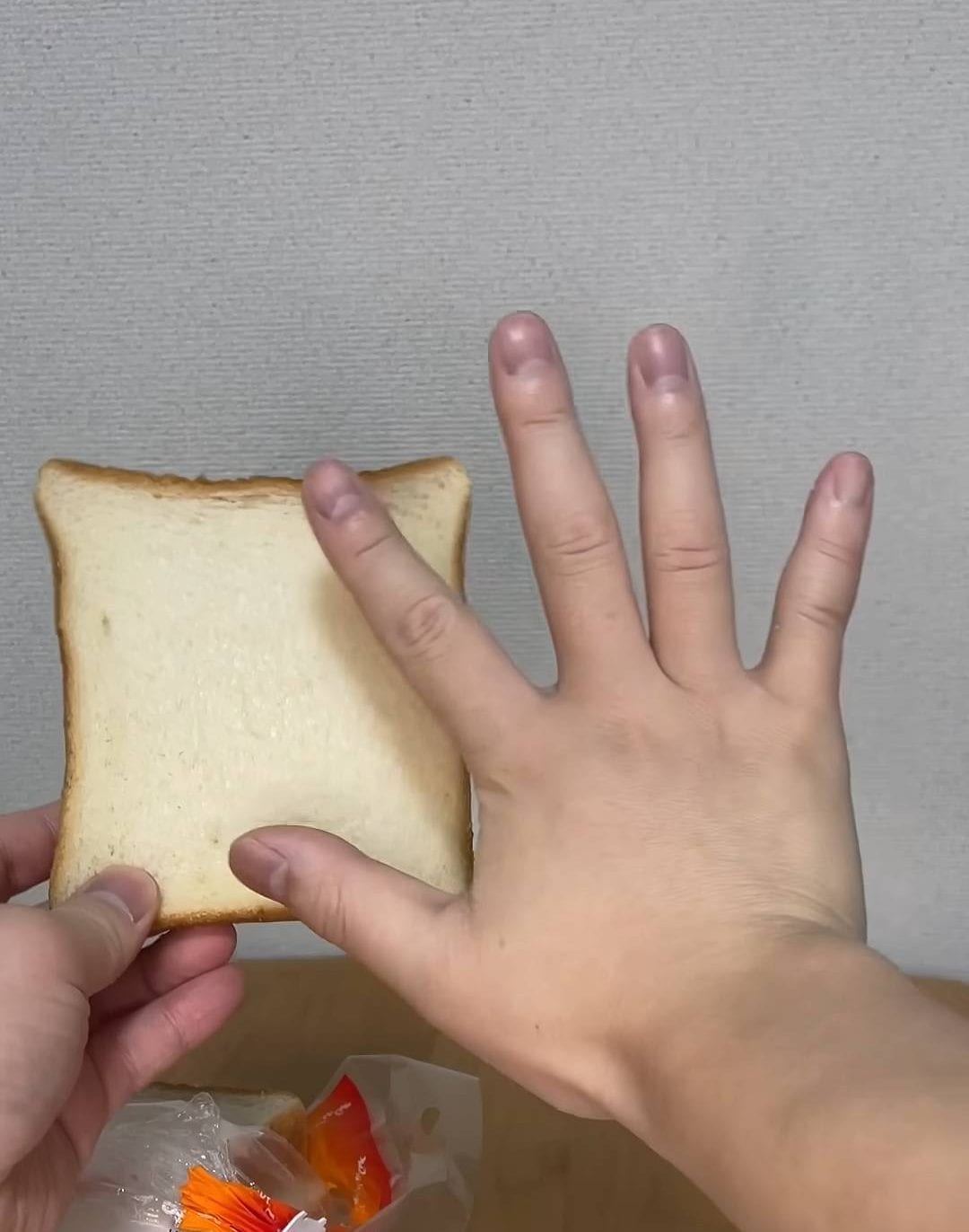 ハシダ本人も手の大きさをたびたびネタにしており、2023年2月には「ハシダめちゃめちゃ手デカいです!」という動画を公開。「バスケットボールも片手で持てるし」「分かりやすく食パンで比べるとこれくらいデカいです!」と語り、食パンより一回りも二回りも大きい手を映していました。