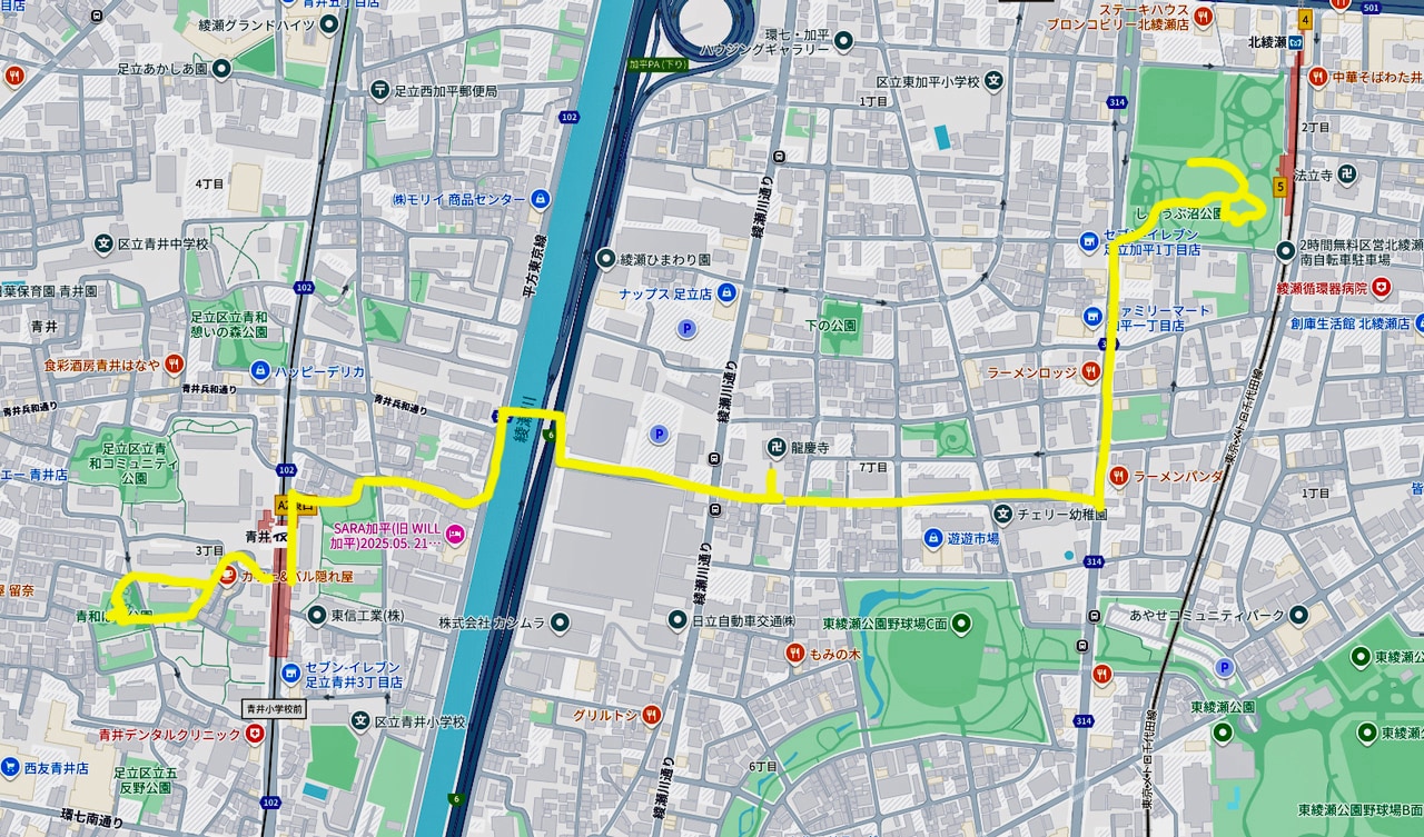 Google mapで青井駅周辺から歩いて来たルートです。