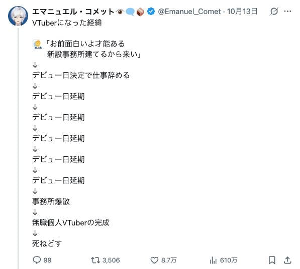 話題になっているのは、13日に「エマニュエル・コメット」(登録者数1000人)(通称:マニュ)が投稿した「VTuberになった経緯」というポストです。