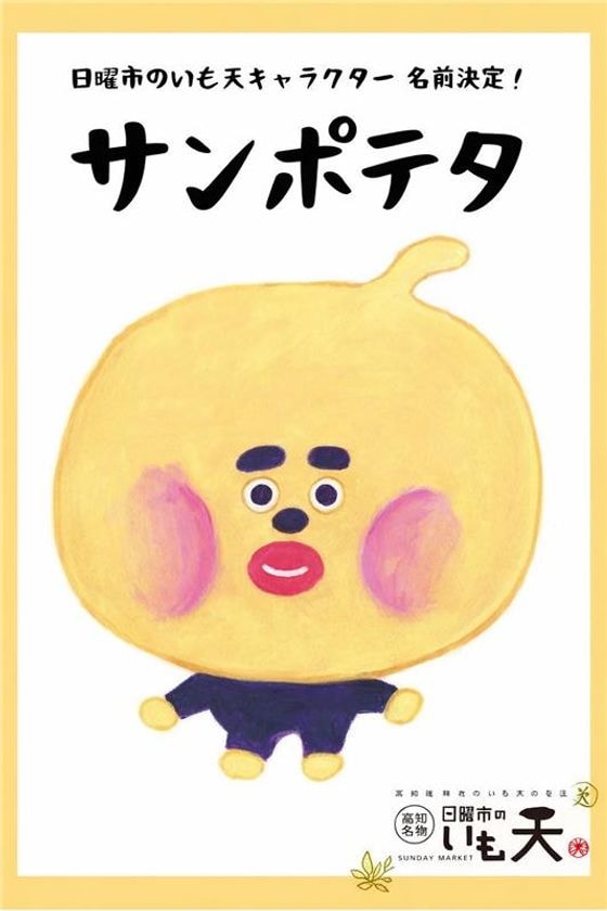 サンポテくんは、人々のお腹と心を満たすことに燃えるほっこりとした優しい芋男。名前には、「100年愛される存在に」という思いが込められており、公募によって決定されました。その期待に応えるべく、広報大使として「日曜市のいも天」を全国にPRします。サンポテくんからの一言「日曜日になると、こじゃんと、いも天が食べたくなるき!」