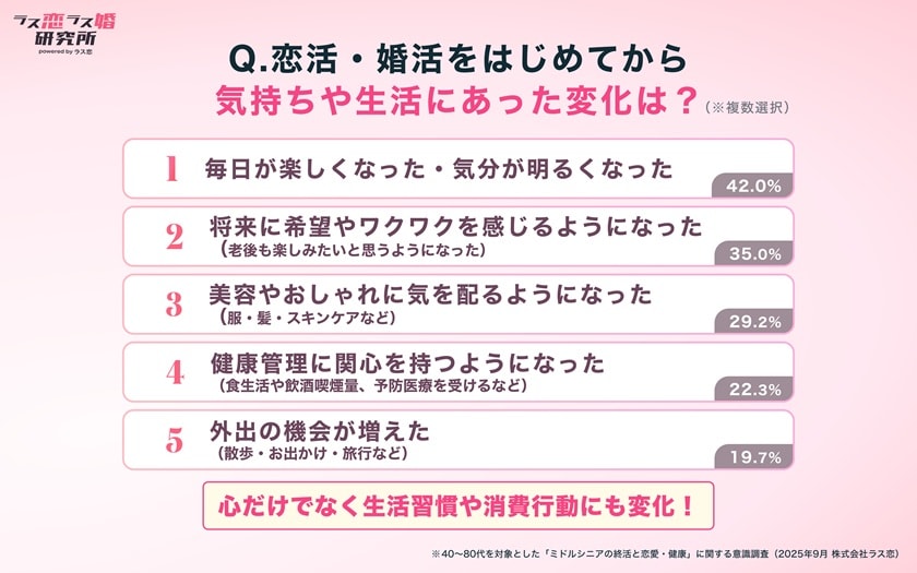 いくつになっても気持ちを高揚させてくれるのが恋愛。アプリを運営しているラス恋(東京)が40〜80代の「ラス恋」ユーザー1926人を対象に実施した「恋愛と健康寿命」に関する意識調査によると、恋活・婚活
