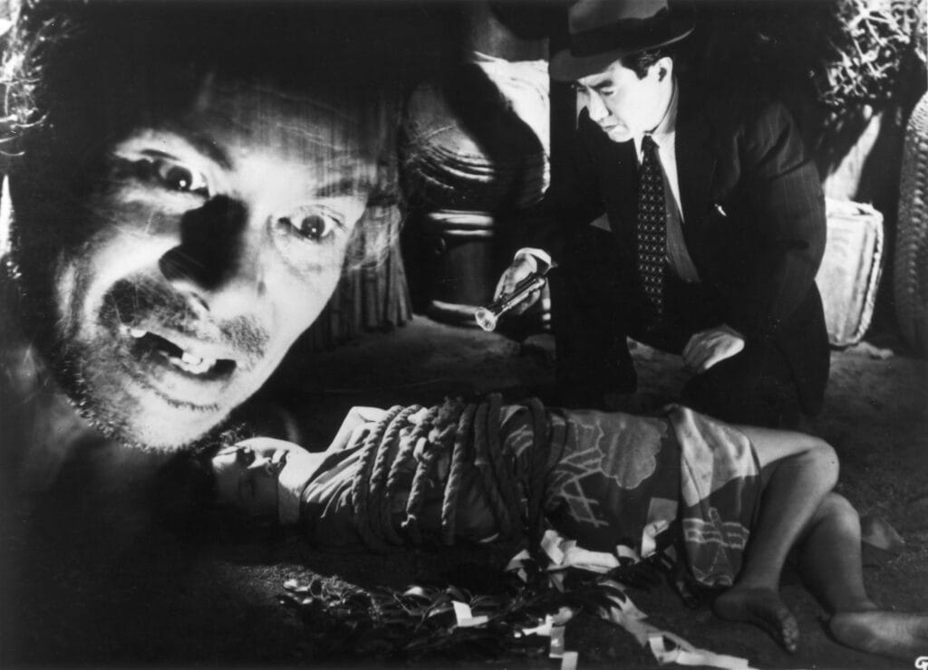 もう一つ注目してほしいのが、「三本指の男」と「獄門島 総集篇」。当時の日本は連合国軍の占領下で、千惠蔵は時代劇の製作をGHQに禁じられたために、〝多羅尾伴内〟や〝金田一耕助〟など現代劇のヒーロー役に、自分の活路を求めた。さらにこの2本では、閉鎖的な田舎で連続殺人が起こる。その調査に乗り出すのは、アメリカ帰り(原作の金田一もアメリカ滞在の過去がある)の颯爽とした探偵だ。日本の封建的な社会が遠因になっている陰惨な事件を、アメリカナイズされた名探偵が解決する。その対比に、作り手は新時代のミステリ映画を見つけようとしたのではないか。つまり金田一のスーツ姿は、時代が求めたヴィジュアルイメージでもあったのだ。