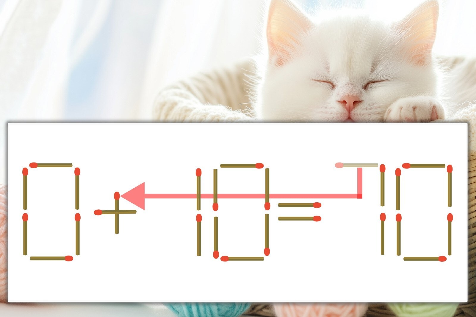 「7」を別の数字に変化させると答えが導き出せます。「7」のマッチ棒を1本移動して、「-」を「+」にしてみましょう。すると、「0+10=10」が成立します。