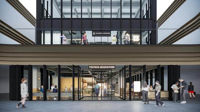 書店とカフェを融合した「TSUTAYA BOOKSTORE」は、2階の書籍売り場はビジネス書を中心とした品揃え。ライフスタイル雑貨も展開します。3階「SHARE LOUNGE」は、半個室やオープン席、会議室を備え、仕事や学習のほか、読書や休憩にも利用できる空間になります。