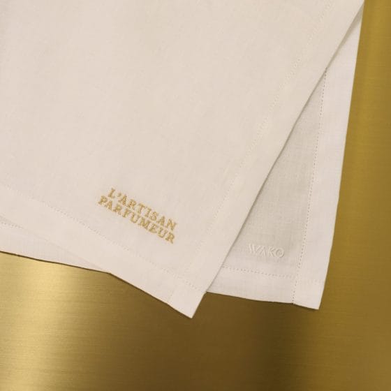 香水を購入すると、ラルチザン パフューマーのオリジナル刺しゅうが入った和光のハンカチーフが数量限定でプレゼントされる。