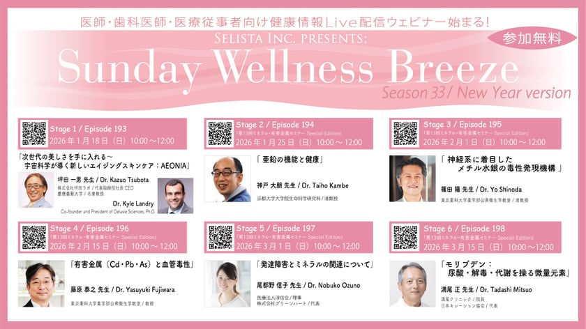 2026年1月18日開催のSeason 33開幕は、宇宙環境成分を使用した新しいスキンケア製品「AEONIA」を取り上げます。株式会社坪田ラボの代表取締役社長である坪田一男先生とDelavie Sciences社の共同創業者であるDr. Kyle Landryが、この新世代の美を追求するスキンケア製品について解説します。ぜひ登録して視聴してみてください。ミネラル・有害金属セミナー Special Edition