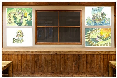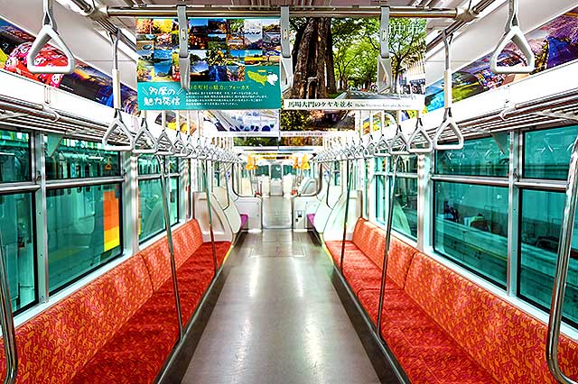 みて、これが車内。平成狸合戦ぽんぽこラッピング多摩モノレールは、多摩エリア30市町村の魅力を体感できるつくりに。