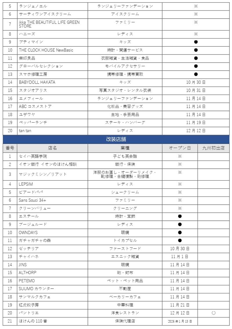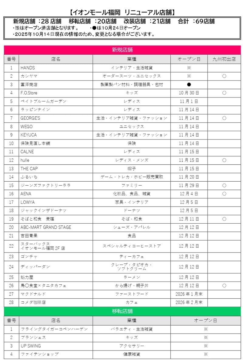 「イオンモール福岡」リニューアル店舗一覧(新規28店、移転・改装41店)