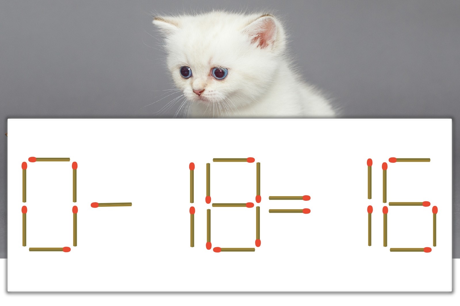 「8」を別の数字に変化させると答えが導き出せます。「8」のマッチ棒を1本移動して、「-」を「+」にしてみましょう。すると、「0+16=16」が成立します。