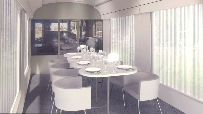 Laviewの特徴である「やわらかく風景に溶け込むデザイン」をさらに進化させ、鏡のように輝く車体となり、沿線の魅力を映し出します。車内はグレーを基調としたトーンで、料理や景色が引き立つようスポットライトやテーブルライトが設置されます。