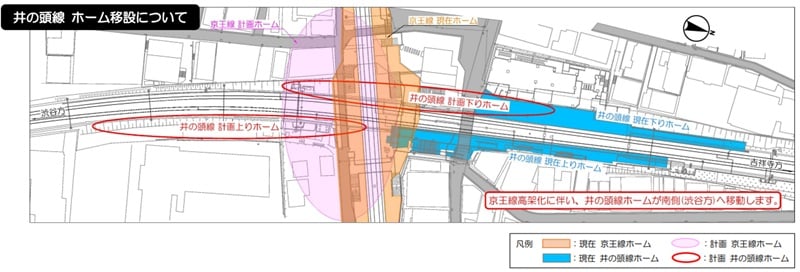 京王電鉄は準備工事に着手。ホームの移設は京王線明大前駅上り線の高架化切り替え時期に合わせて実施する計画としており、具体的な移設時期などの詳細は「今後の工事の進捗に併せてお知らせする」としています。