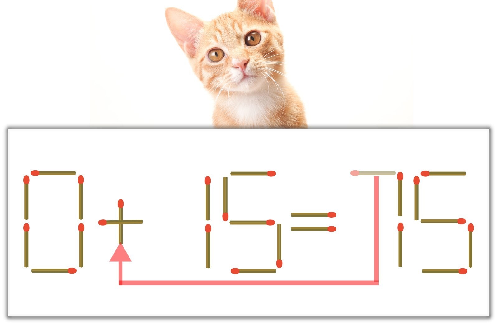 「7」を別の数字に変化させると答えが導き出せます。「7」のマッチ棒を1本移動して、「-」を「+」にしてみましょう。すると、「0+15=15」が成立します。