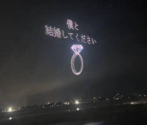 ドローンショーによるスポンサー企業の紹介がおこなわれた後で、夜空には「ともかさん」という文字とともに赤いハートの絵が浮かび上がりました。文字は切り替わり、「僕と 結婚してください」というメッセージが現れました。文字の下にはダイヤの指輪が大きく描かれています。
