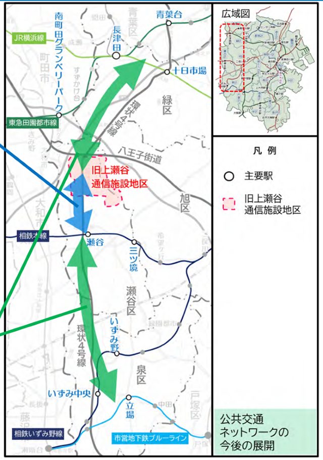 上図の青い部分が新テーマパークなどへのアクセス用に検討されている瀬谷駅~上瀬谷ターミナル部分で、将来的には緑の部分までバスなどを利用する事で、公共交通ネットワーク構築を目指すということです。