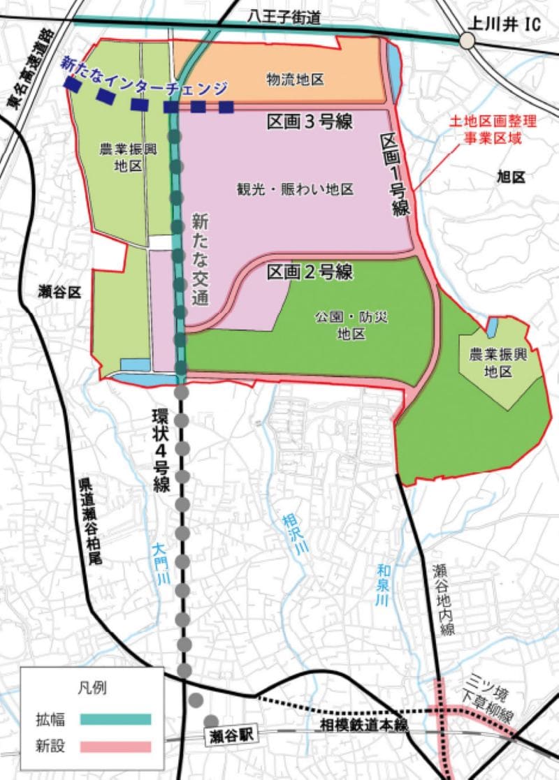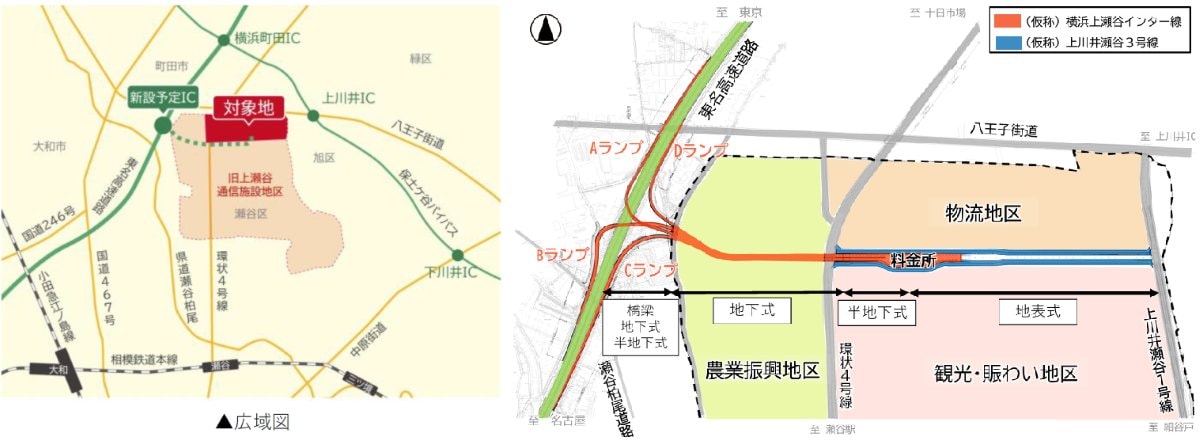 新しい東名高速のICは、横浜町田ICの南側(静岡側)約1.5kmほどの位置になる見込みで、東京方面と名古屋方面に乗り降りができるICとして整備予定です。この新ICの一般道の出入口は、本線の東側に位置する旧上瀬谷通信施設の一番北側、「物流地区」に設置されます。この高速道路本線から一般道出入口までの区間の大部分は、周囲の環境に配慮して地下に設けられる方向で、横浜市が環境影響評価書を掲示した段階です。