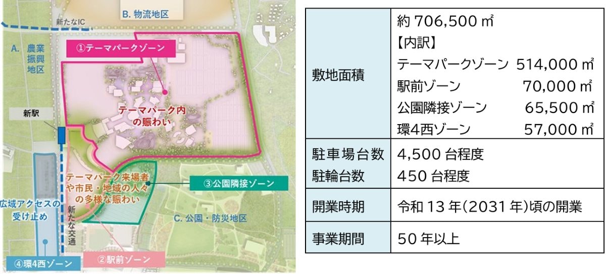 観光・賑わい区域の開発のメインとなるのは、51万平米の「テーマパークゾーン」です。他にも、瀬谷駅から結ばれる新しい交通の拠点入り口となる「駅前ゾーン」、「GREEN×EXPO 2027」の会場跡地に整備される広大な公園との接点となる「公園隣接ゾーン」、そして空港や主要都市などからのバスターミナル機能を持つ 「環4西ゾーン」という4つのゾーンが整備される予定です。