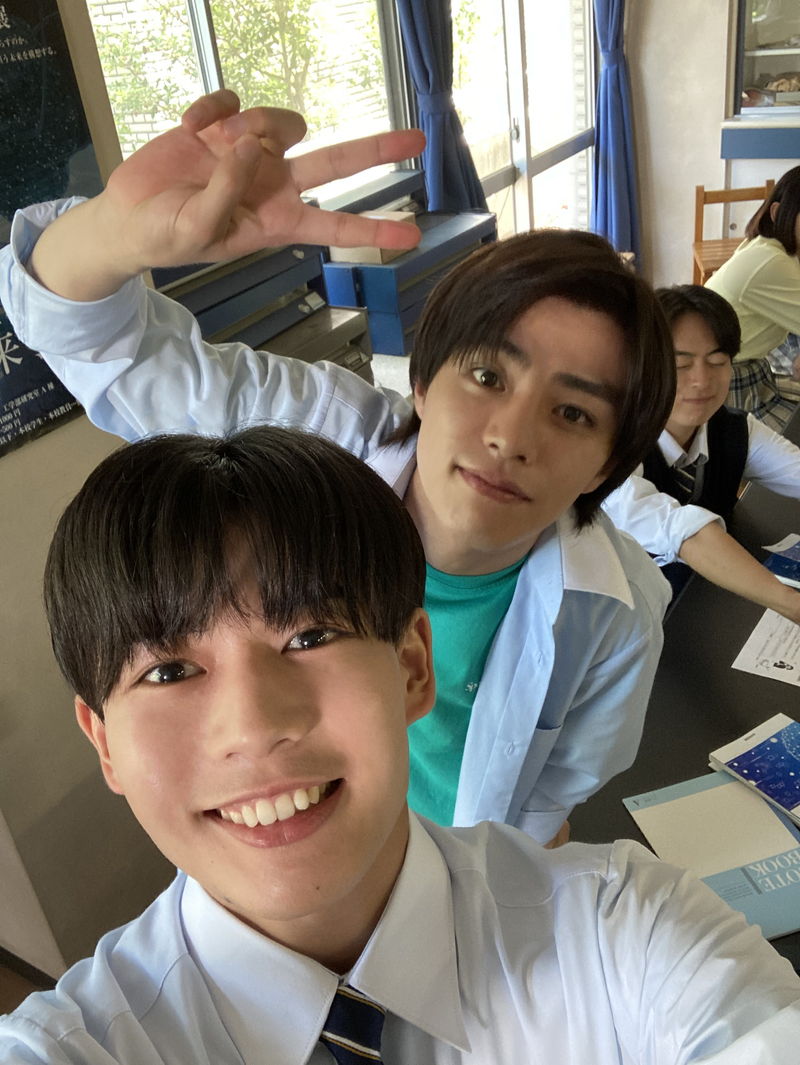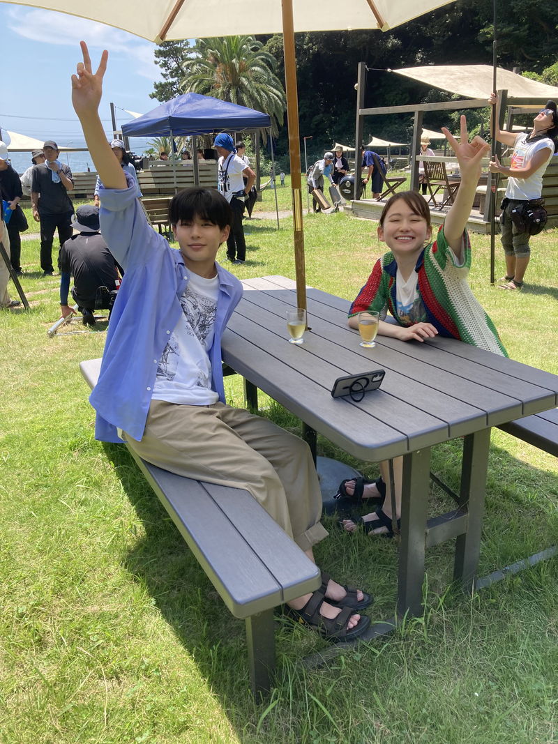 公開されたのは、現場でスタッフや長尾自身が、スマートフォンで撮影したメイキングショット。内気な男子高校生・宮嶺を演じる長尾謙杜は、宮嶺をいじめる同級生を演じた醍醐虎汰朗と笑顔で自撮りを楽しむ姿を見せている。一方、学校中の人気者・景を演じた山田杏奈は、ある衝撃シーンの撮影時に、血だらけの姿で長尾とピースサイン。物語の刺激的な展開とは対照的に、現場は終始、笑顔に包まれていたことがわかる。さらに、バーベキューシーンの撮影での、ふたりでカメラに笑顔を見せるカットや、猛暑の撮影を乗り切るために頭に氷のうを乗せてクールダウンする山田のキュートな姿も収められている。