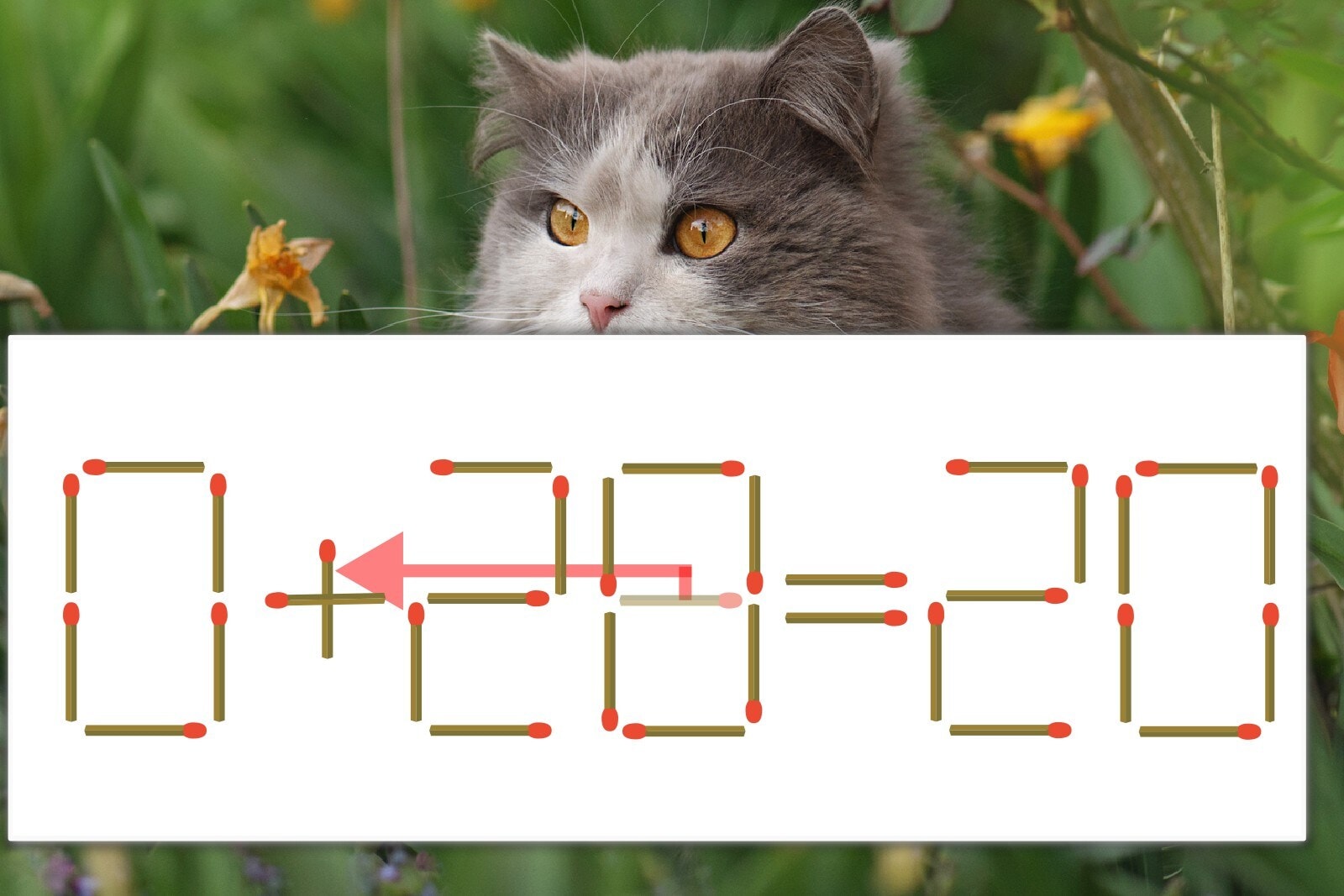 「8」を別の数字に変化させると答えが導き出せます。「8」のマッチ棒を1本移動して、「-」を「+」にしてみましょう。すると、「0+20=20」が成立します。