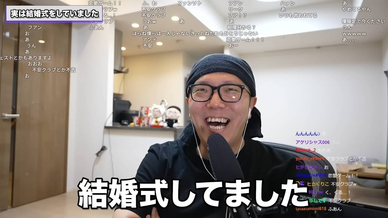 配信の中でヒカキンは、視聴者から配信頻度が最近下がっている理由を尋ねられます。「ネタバレになっちゃう」とヒカキンは苦笑いしますが、「(配信は)俺の公式フアンクラブだから別に言ってもいいよな」「『お前もう配信やめたんか』『ヒカキンさん、失望しました』とか言われてたら言い訳したほうがいいわな」と決意した様子をみせます。そして、「結婚式してました」と笑顔で報告します。