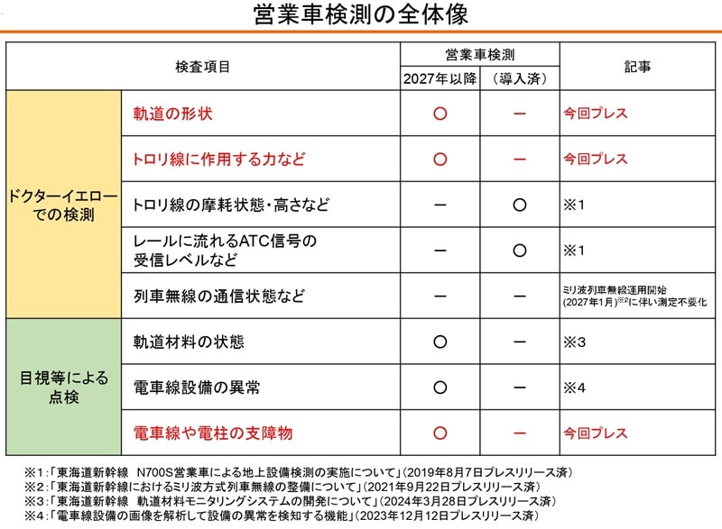JR東海は、今回発表した「軌道検測システム」「架線検測装置」「先頭車画像装置」3つの新技術と、これまでに開発してきたトロリ線の摩耗状態や高さ、ATC信号の受信レベルなどを検測する技術を合わせ、ドクターイエローで行っているすべての検測項目を営業車で代替するとしています。また、社員が目視などで行っている点検の一部も置き換えることが可能となります。