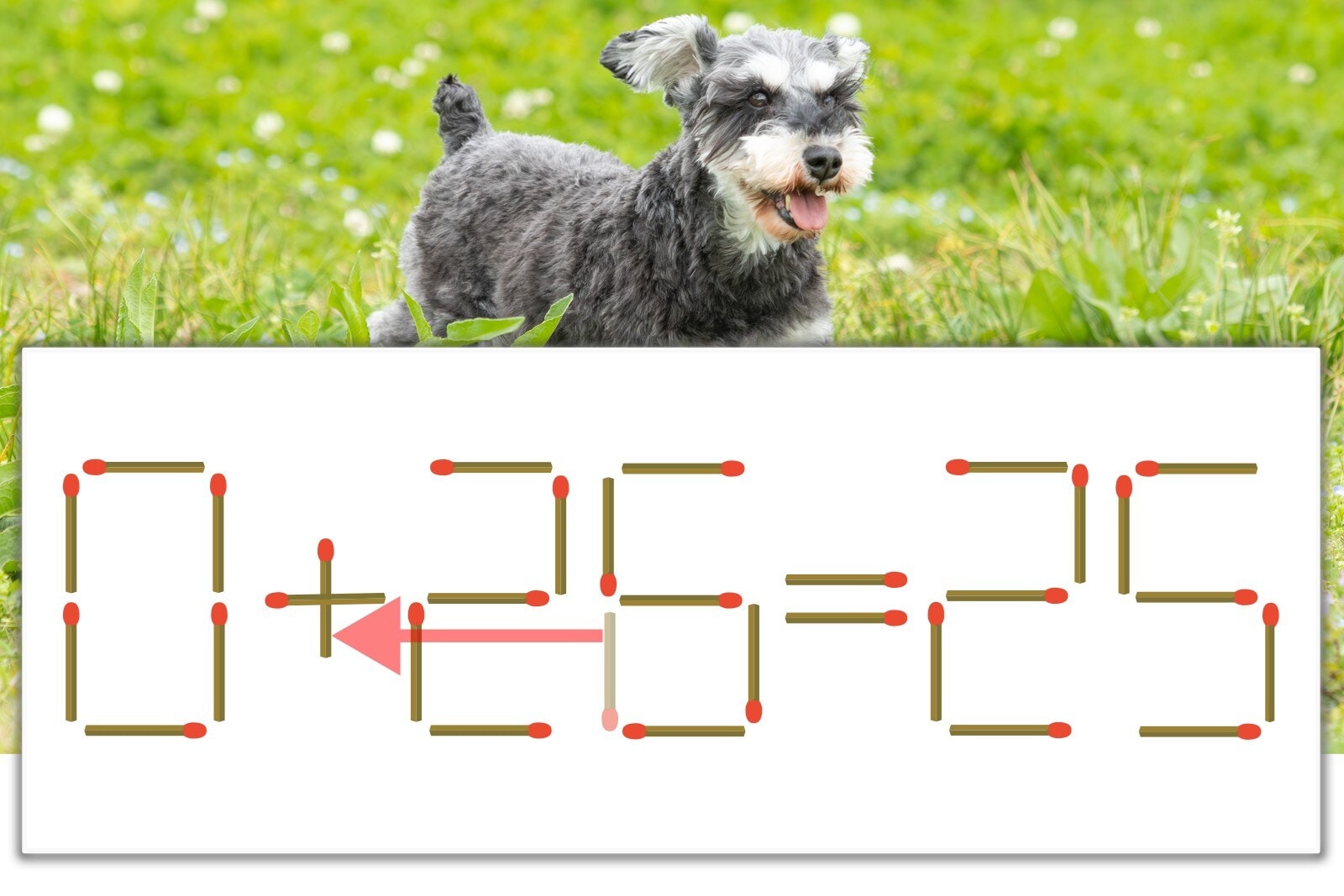 「6」を別の数字に変化させると答えが導き出せます。「6」のマッチ棒を1本移動して、「-」を「+」にしてみましょう。すると、「0+25=25」が成立します。