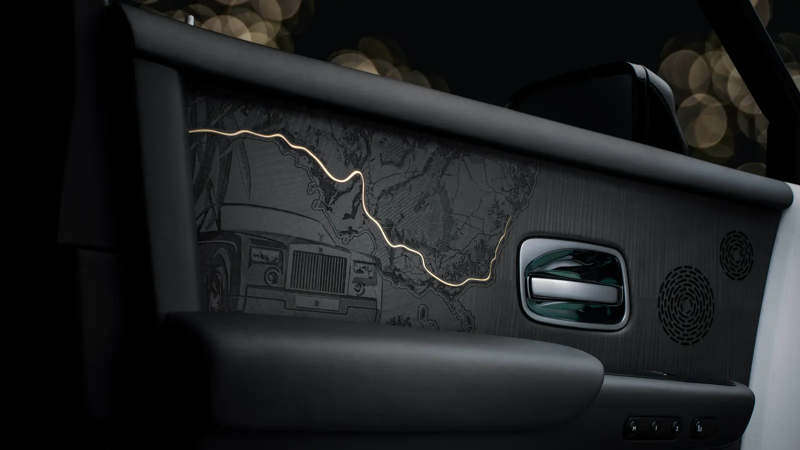 染色されたブラックウッドには、3Dマーカトリー(異なる種類の木材をはめ込んで模様を描き出す、木象嵌(もくぞうがん)と呼ばれる伝統工芸技法)、レーザーエッチング、そして3Dインクレイヤリング(加えて、ふんだんな金箔)が用いられ、ファントムの歴史における最も重要な場所の地図や、それが辿った旅路が描かれている。よし、金箔をふんだんに、というわけではない。厚さはわずか0.1マイクロメートルだ。
