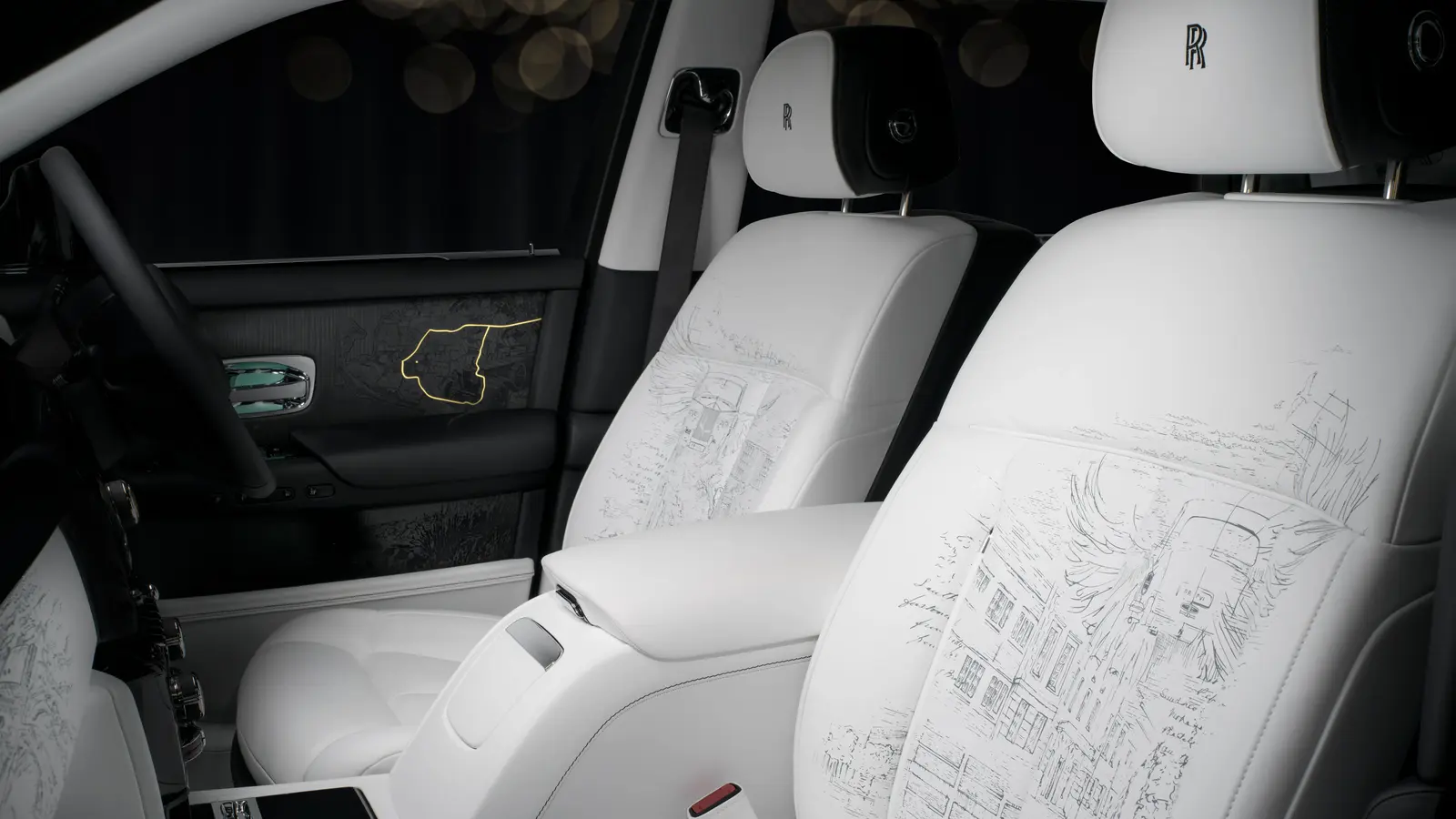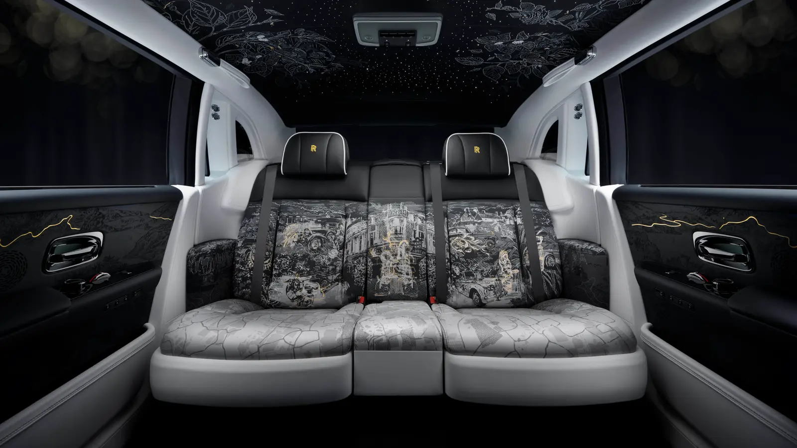 ロールス・ロイスの計算によれば、正確な位置合わせが必要な45の独立したパネルにまたがる、このシートの「アートワーク」は、16万ものステッチで構成されているという。そして、そう、よく見れば後部座席にはテディベアがいる…