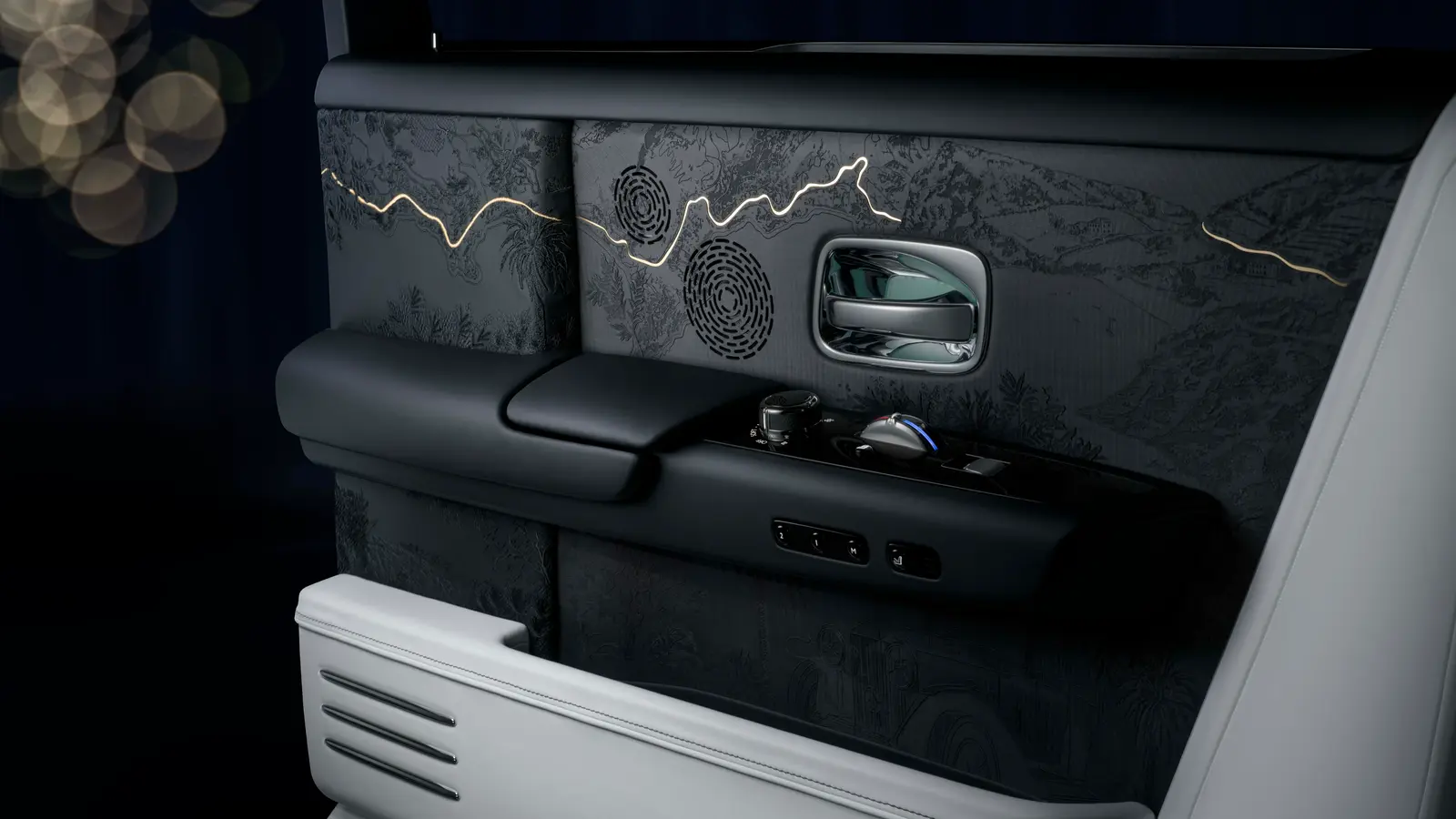 そして、なんという内装であろうか。後部座席は、ファントムの歴史における重要な場所や瞬間を重ね合わせた、手織りのタペストリーとなっている。ロンドンにあった同社の最初の拠点、コンデュイット ストリートから、ヘンリー ロイスが描いた南フランスの油絵、歴代ファントムのスケッチ、そして著名なファントムオーナーの刺繍まで、歴史的な先祖返りの豊かな、うーん、タペストリーである。実に、ここに屁をこくのはもったいない。