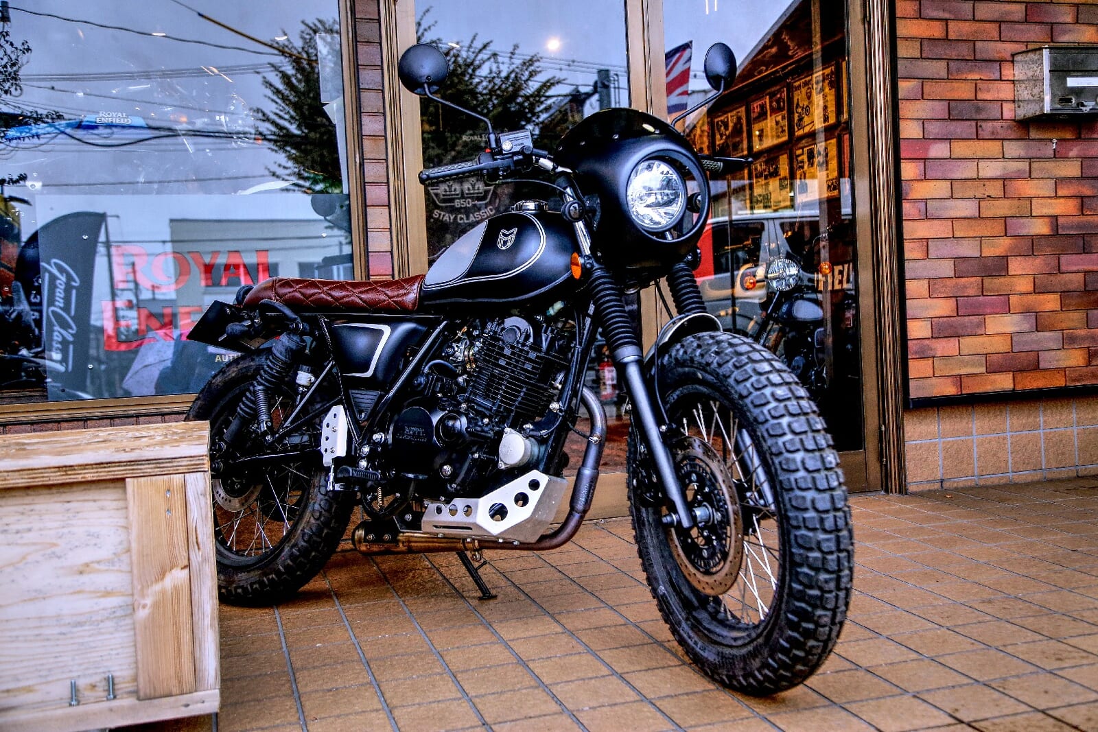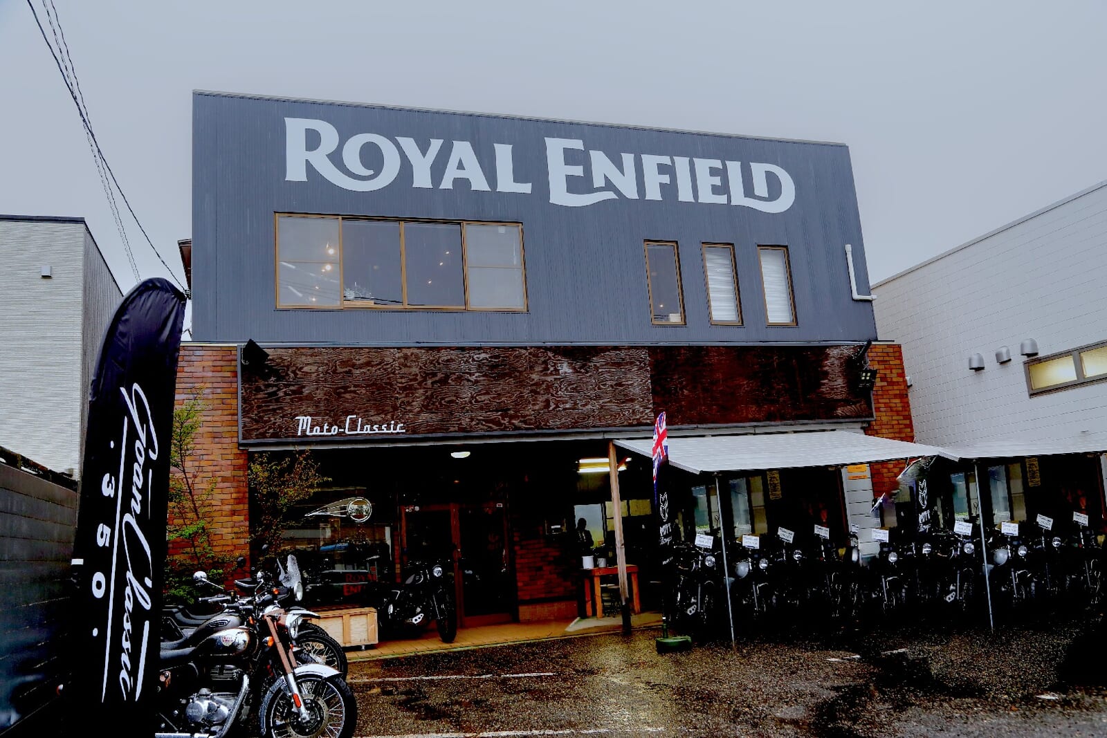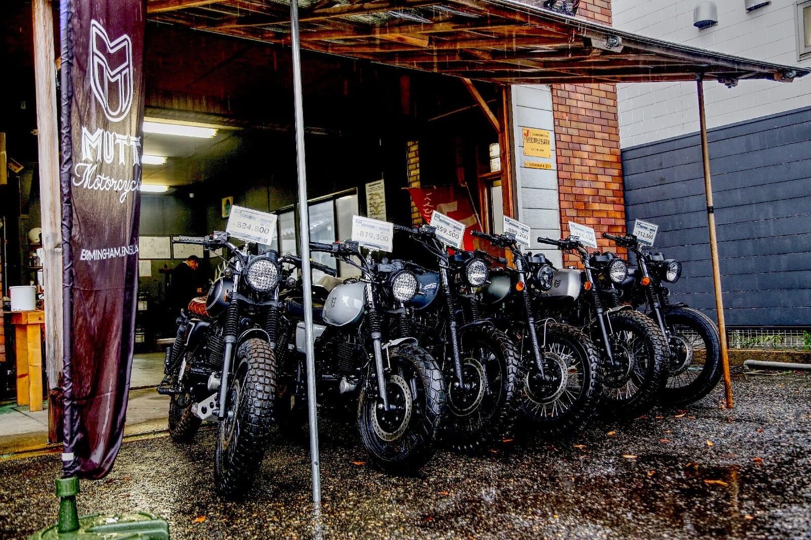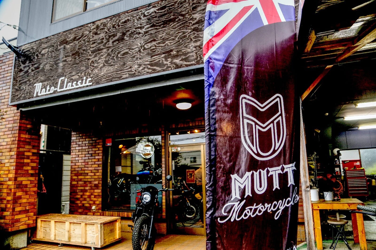 MUTT新潟は、JR新潟駅から車で約10分の新潟市東区竹尾4丁目に店舗を構える。新潟バイパスの竹尾ICからほど近く、日本海東北自動車道の「新潟東スマートIC」と新潟空港を結ぶ幹線道路沿いという、地元の人々には馴染み深いロケーションだ。大きな「MUTT MOTORCYCLES」の看板の奥には、黒とレンガを基調としたシックなショールームが佇む。その前に並ぶレトロなバイクたちの姿は、まるで週末の英国パブにバイク乗りたちが集っているかのようだ。