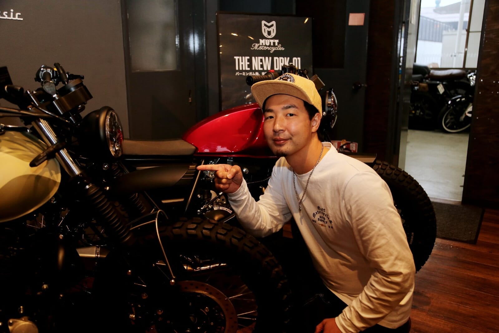 今回お話を伺った荻原圭佑さんは、現在29歳。MUTTディーラーの中でも若手の店長だという。長く四輪メカニックとして経験を積んだ後、MUTT新潟へもメカニックとして入社。現在はバイクを整備する傍ら、店長も任されるというまさに「二刀流」の活躍を見せている。180cmを超える長身にMUTTのロンTがよく似合う好青年で、メカニックにありがちな気難しさは微塵も感じさせない。彼のカジュアルでオープンマインドな姿勢そのものが、MUTTの目指すブランドの世界観を体現しているかのようだ。